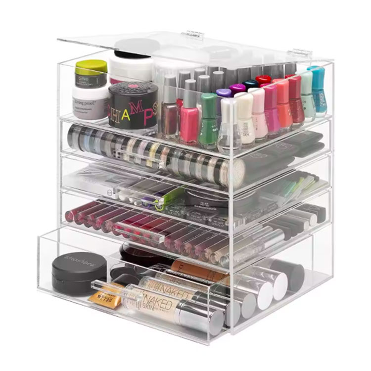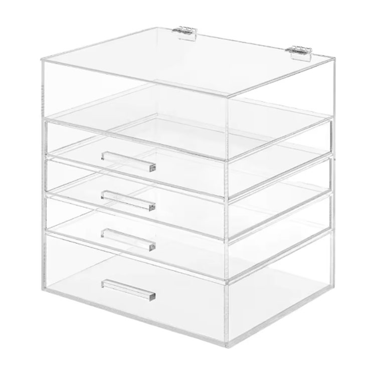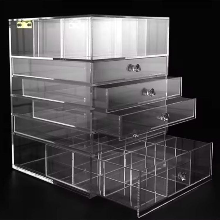 * วัสดุอะคริลิค:มีความโปร่งใสสูง สามารถแสดงลักษณะและสีของเครื่องสำอางได้ดี มีความทนทานและสวยงามสูง กล่องแสดงอะคริลิกมักใช้สำหรับแสดงเครื่องสำอางระดับไฮเอนด์